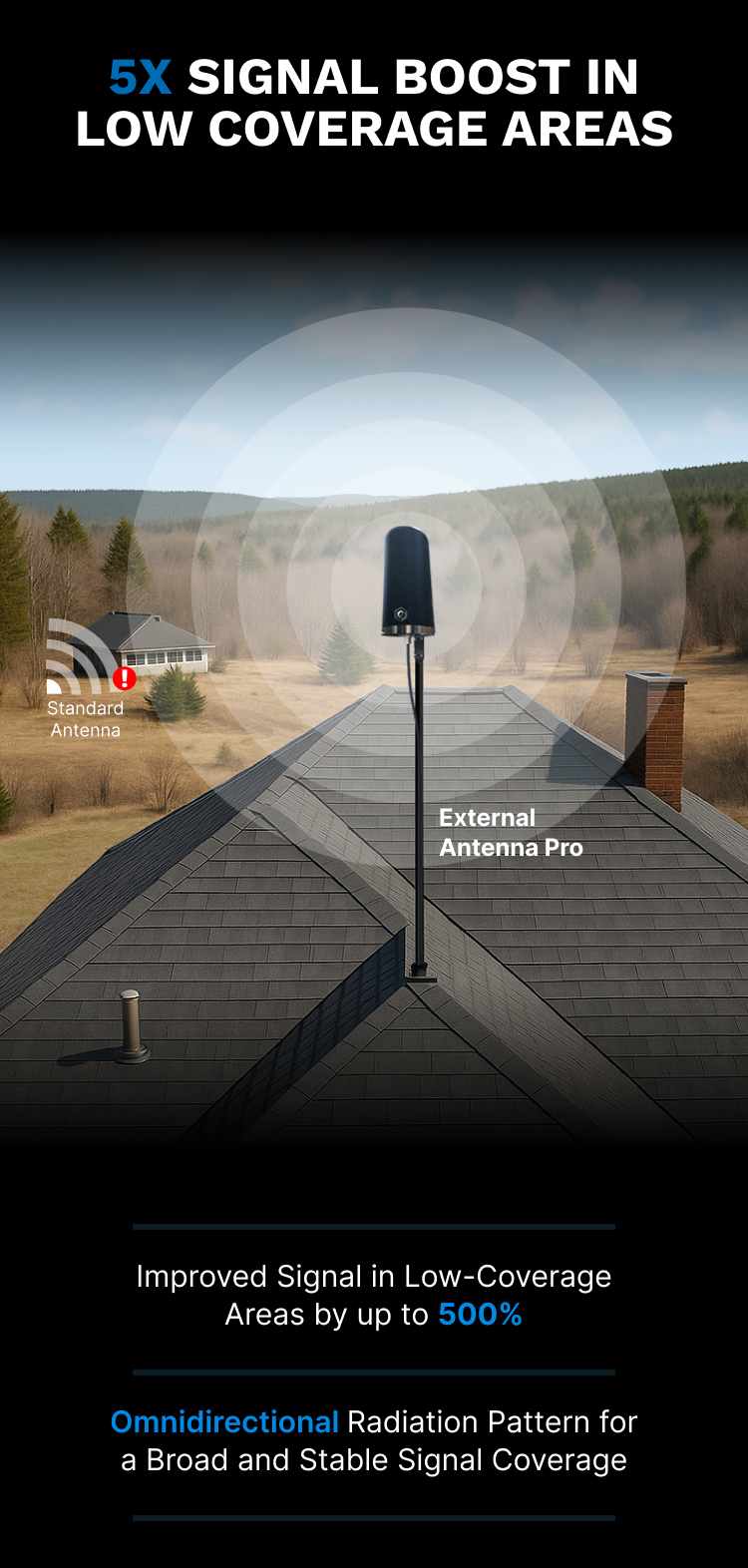 When standard range isn’t enough or when there are signal drops, our high-gain external antenna steps in. Designed to boost connectivity strength in low-coverage areas.