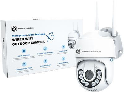 Optima X3 Pro outdoor PTZ security camera by Premium Invention with dual antennas and night visionWhite security camera with antennas and a 'Spring Sale' card.